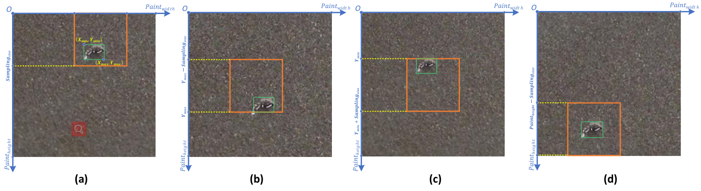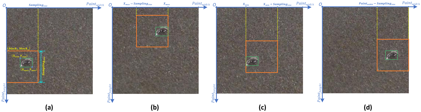 - 选择适合缺陷大小的采样块尺寸: 本文使用的缺陷检测算法基于改进的MobileNet-SSD算法,该算法将输入图片的大小统一为300 * 300。为了保持长宽比不变,将采样块取为正方形,其大小由车身油漆图像中缺陷的大小确定。设置确定大小不同的缺陷的采样块大小的规则: 首先确定油漆图像中缺陷区域的大小,根据大小确定采样块的大小,然后随机选择确定的采样块大小量程范围内的10倍。 这可以有效地增加样本块位置的随机性,并提高后续检测的准确性。