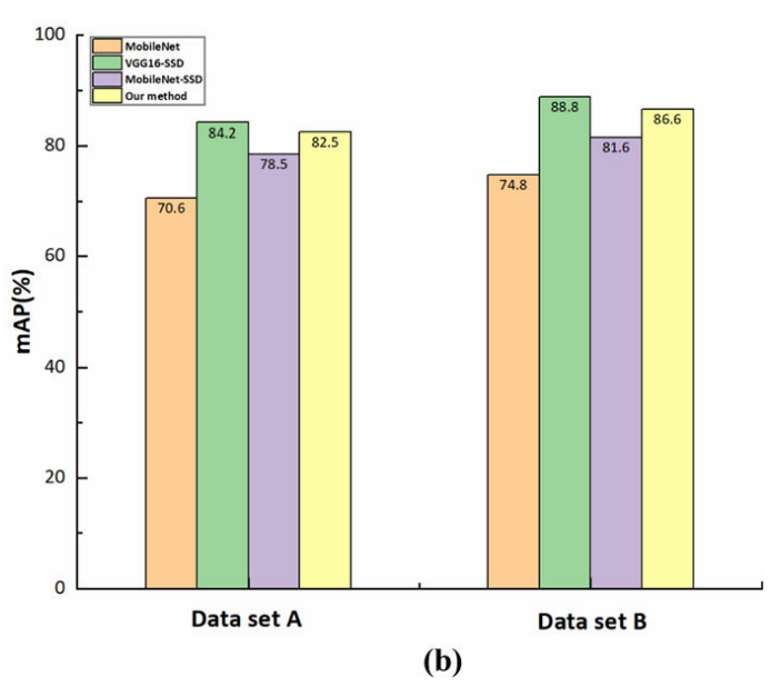为了证明数据增强算法的优化效果,分别在data setA 和data setB上对MobileNet算法,VGG16-SSD算法,MobileNet-SSD算法及其改进MobileNet-SSD进行训练和测试,利用mAP作为模型测试指标。结果如下图所示: