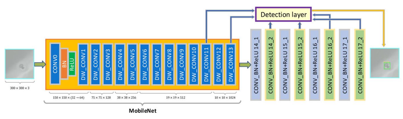 输入图像的大小规格化为300×300。从Conv1到Conv13使用深度可分离的卷积层,并在后面添加了8个标准卷积层。卷积层和BN层在添加的卷积层上合并,并提取Conv1,Conv2,Conv3,Conv4,Conv5和Conv6的卷积层作为detection layer。该方法可以有效解决梯度消失和梯度爆炸的问题,减少计算量,提高模型的性能。