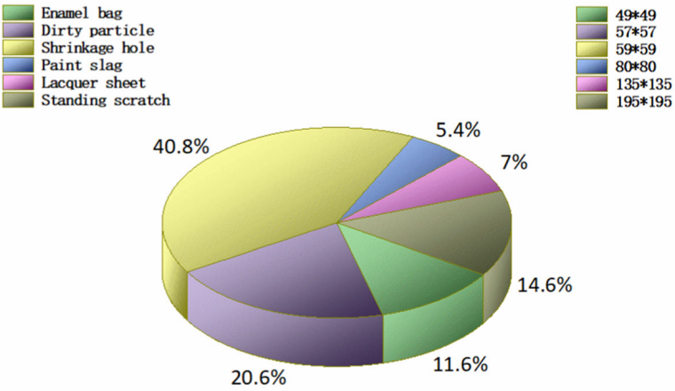 针对质量检验车间与汽车装配线的生产环境相同。上部在LED灯的照度下。在这种工作环境下,手动捕获油漆图像,可以更好地恢复真实的检测效果,提高算法的鲁棒性。共收集500张图像和300个视频。500张图像包括:58个搪瓷袋,204个收缩孔,103个脏颗粒,73个划痕,27个漆渣和35个漆板组成。
