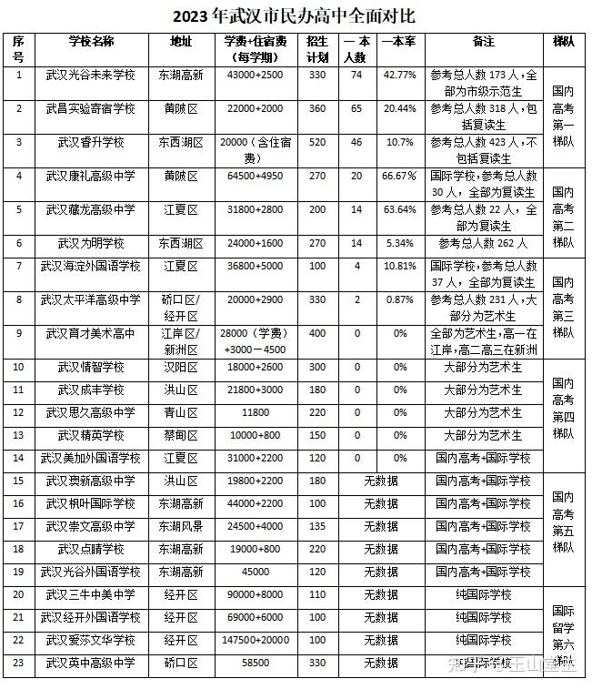 以下是本人根据教育部门公示信息整理的武汉市民办高中的六个梯队(一本率和一本人数参考2023年武汉市高三二月调考的官方数据,只包含大文大理,不包含艺术生):