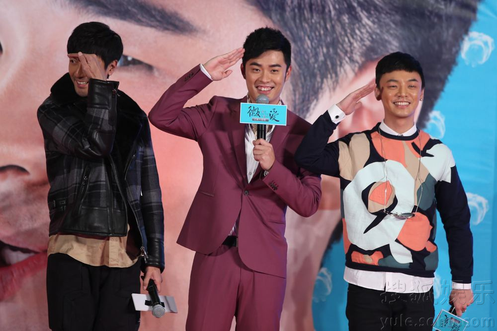 《微爱之渐入佳境》发布会上,另外两个男演员举手敬礼,只有而张鲁一做了个经典的猴子手搭凉棚的动作。