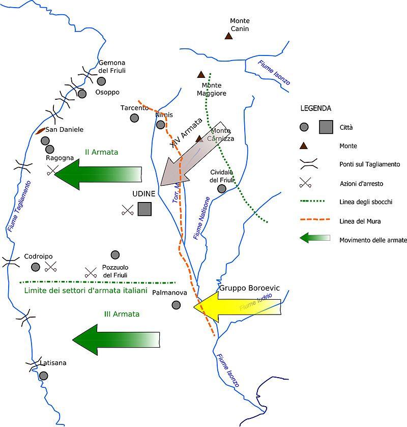 此时意大利的情况也极为糟糕,当年8月教皇已发出和平倡议、国内的反爱国和平主义者因为前线极高的阵亡数而不断宣传反战言论,但陆军屏蔽了所有的国内外新闻,士兵不允许回家探亲。再一次令奥地利人感到心寒的是,意大利总参谋部又一次通过捷克叛徒得知了德奥联军进攻的消息,好在卡多尔纳无从得知同盟国主攻方向、其部下第二集团军司令卡佩罗也未按照总参谋长的命令调整到更适合防守的阵型——前者始终执着于进攻,让德奥第14集团军有个大空子可以钻。
