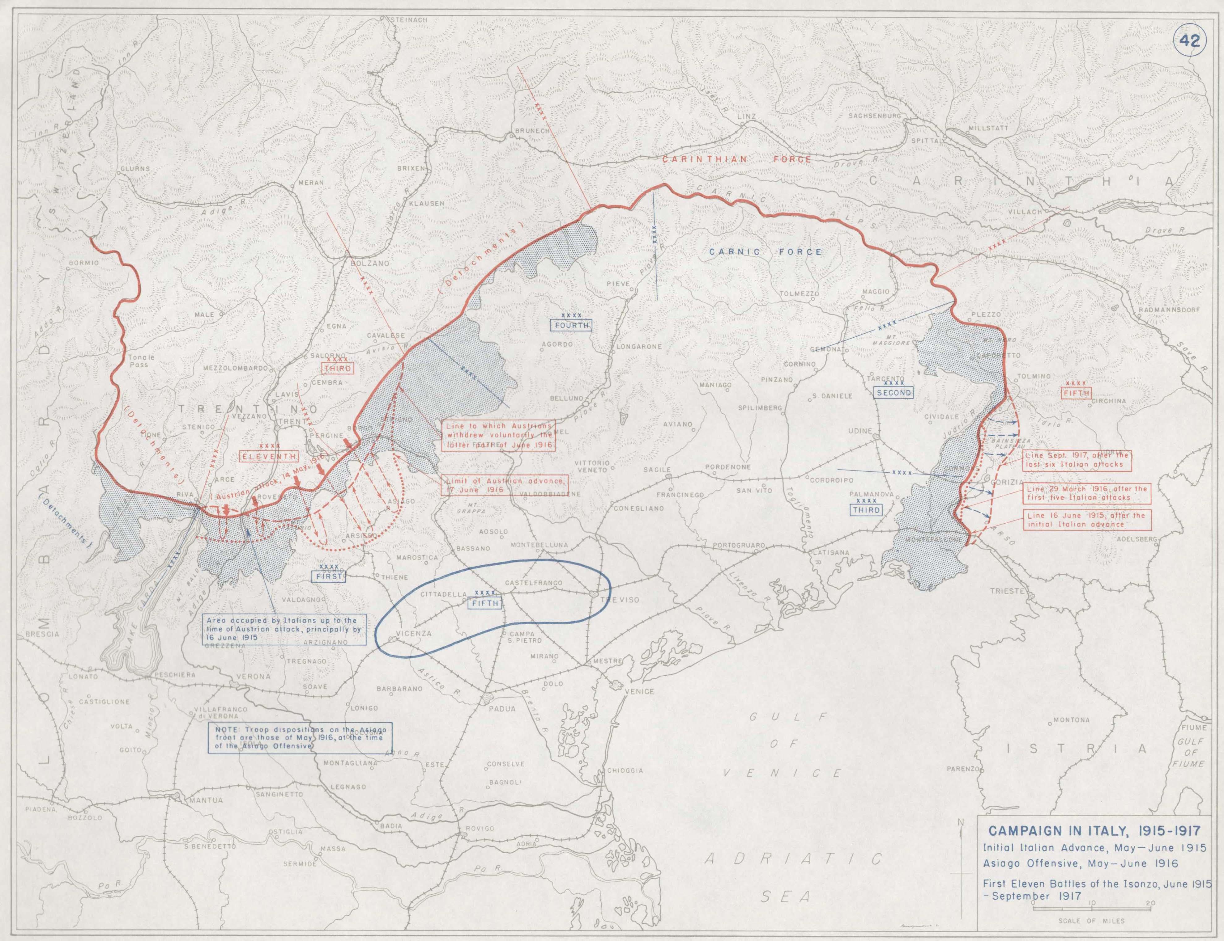 如今新的意大利战线,比起原本缩短了170km,可分为两段:从瑞士边界到阿夏戈高原的防线,和卡波雷托之前几乎没有变化;第二段则是从阿夏戈经过格拉巴山再到皮亚韦河最后到亚得里亚海岸边的战线,全长仅有140km。