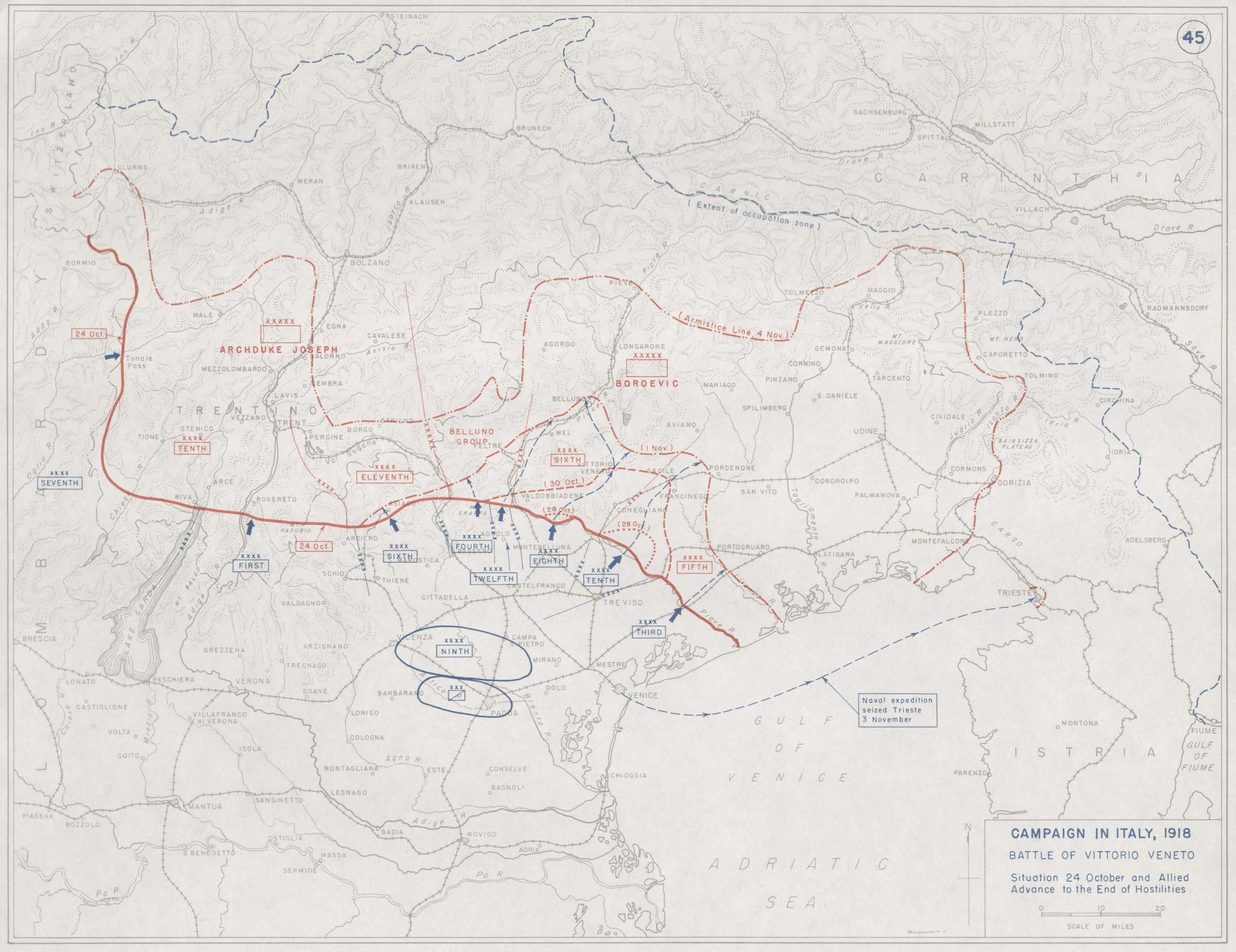 1918年11月11日后,意军进入蒂罗尔,占领了因斯布鲁克。同时根据伦敦条约,北达尔马提亚(扎拉港)、伊斯特利亚半岛、特罗蒂诺-上阿迪杰、十二群岛等地将归属将意大利,阿尔巴尼亚为意大利保护国。