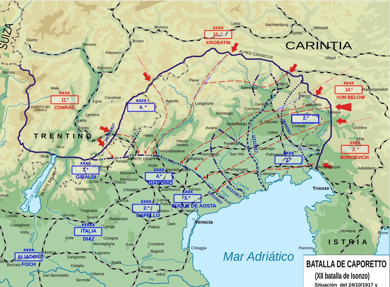 这也可以解释卡波雷托两人之间的纠纷。执着于对德奥军先手出击的卡佩罗在战役前因病离开前线,前往维罗纳养病。10月24日意二集被干爆的当晚他回到指挥部,请求卡多尔纳准许他的部队往后撤退50公里,结果被后者拒绝。这一拒绝很有可能是总参谋长为报复卡佩罗在疗养前的进攻言论和抗命,现在两人的主张已经互相调换。意军第二、三集团军的撤退令到10月25日才发布,10月26-27日的夜晚才开始实施,此时德奥军早已打穿意军三条间隔过近的防线,开始朝威尼托平原进军。