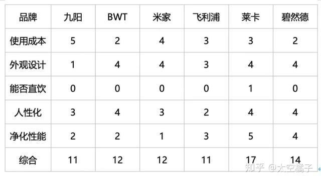 大家可以对比一下首年的开支,我们按照官方说法进行计算,得到以上表格中结果。其中价格最低的是九阳,最高的是BWT,最有意思的是莱卡,莱卡首年赠送微生物阻断滤芯是一大实惠,相当于降了一百多块。