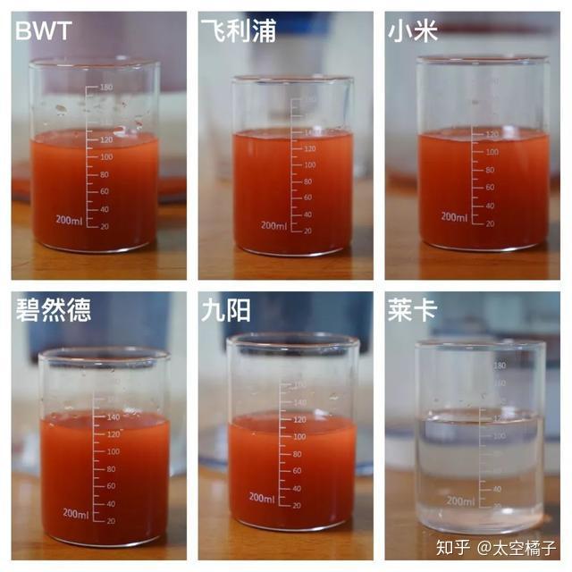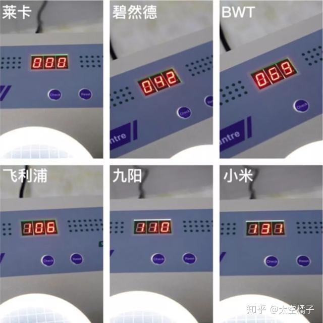 从图上看,颜色最透明的是莱卡,其次是碧然德,稍微有点颜色的是飞利浦和BWT,最后的是九阳和小米,过滤自来水中的余氯的能力比较差。