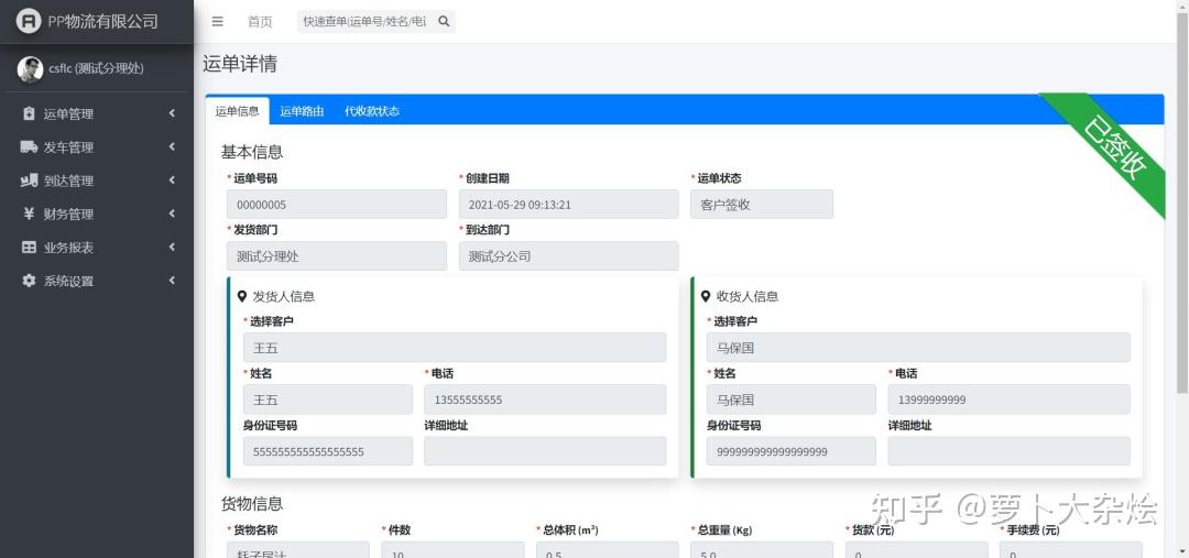 - 实现了运单录入、发车出库、到货签收、客户签收等基本功能。